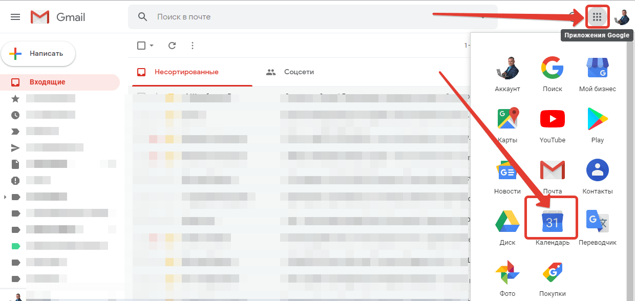 Первый шаг — нам нужно зайти в свою почту Gmail и справа вверху выбрать все сервисы Google. Далее нам нужно кликнуть на иконку Календарь, чтобы перейти к настройкам.