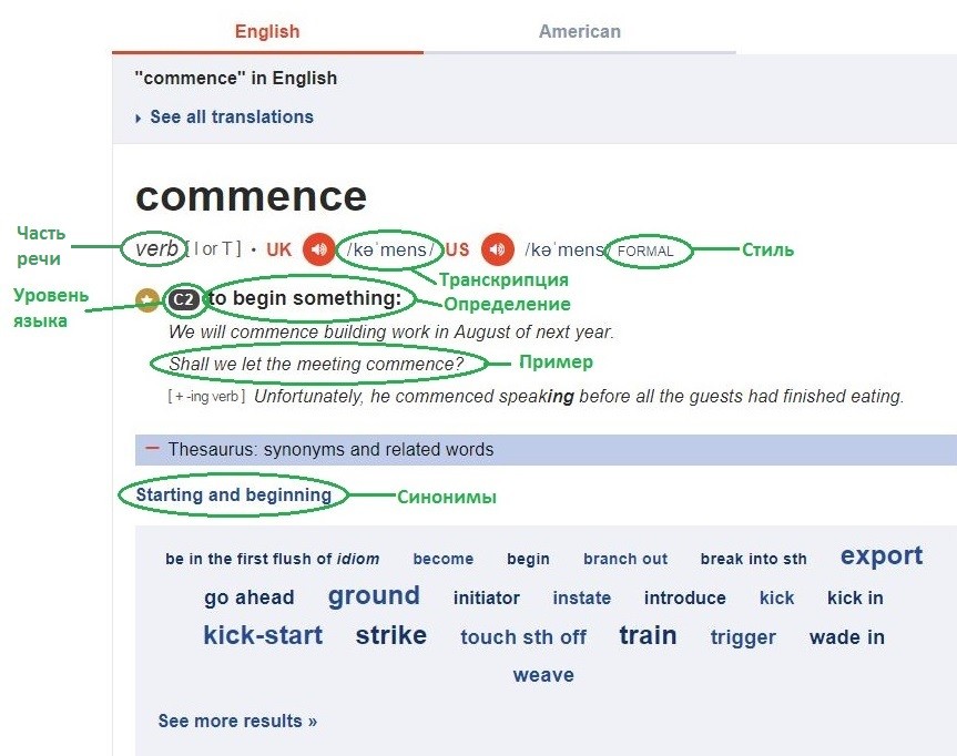 - транскрипция с возможностью прослушать произношение,