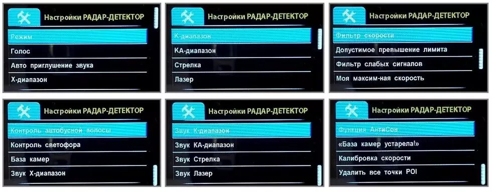 Меню настроек радар-детектора
