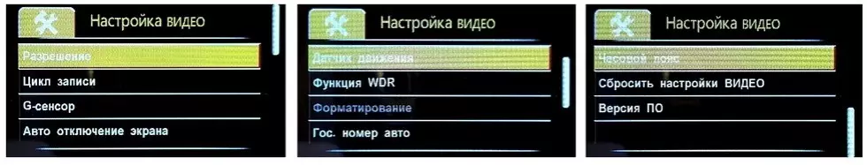 Меню настроек видеорегистратора