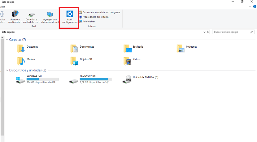 Другой способ, который мы можем использовать, — это файловый менеджер.. Наиболее распространенным является то, что у нас открыто окно проводника, когда мы используем компьютер. Следовательно, мы можем использовать этот метод для доступа к этим настройкам. В виде В Windows 10 появилась кнопка внутри этих параметров, что позволяет нам получить к нему доступ. В этом проводнике мы должны щелкнуть «Мой компьютер», и там, в той части меню, мы увидим кнопку с надписью «Открыть конфигурацию». Просто щелкните по нему, чтобы получить к нему доступ.