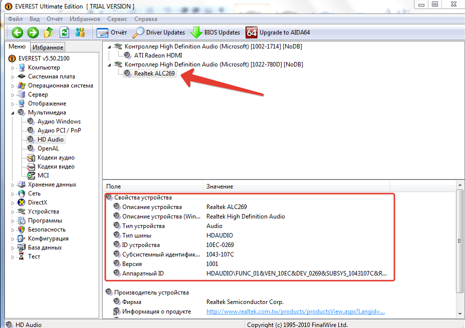 В нашем случае имеется два контроллера, но нас интересует второй «Realtek ALC269» (у вас может быть другая модель, но производитель в большинстве случаев Realtek). Выбрав нужный контроллер, вы сможете увидеть всю необходимую информацию об устройстве, включая ID и аппаратный ID.
