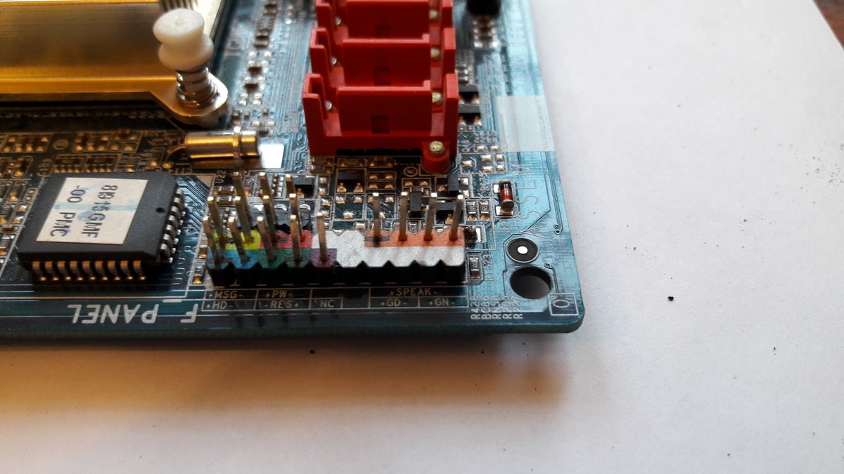 Для начала давайте разберемся, как вообще выглядит то место на материнской плате, куда подключается передняя панель компьютера. Для наглядности просто хочу показать несколько фотографий, по ним вы легко определите, как выглядит этот разъем на материнской плате: