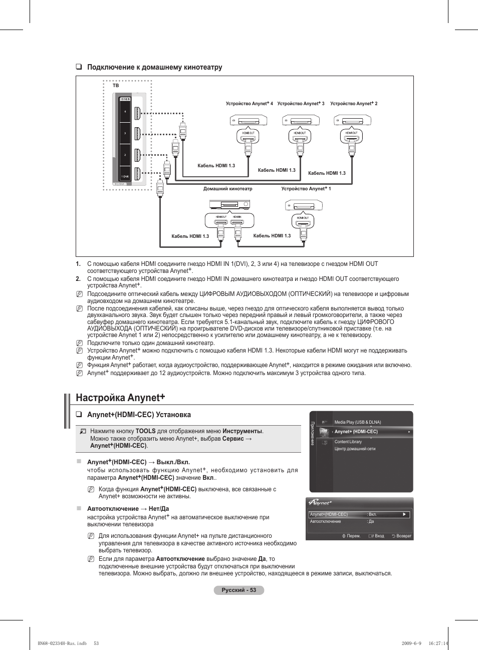 Настройка anynet, Anynet+(hdmi-cec) установка, Подключение к домашнему кинотеатру