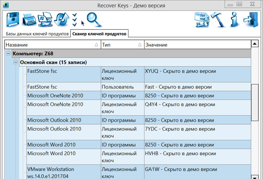 Recover Keys – платная программа, в базовой редакции стоит $30 . Триал-версия ограничена сокрытием части значений ключей. Вся обнаруженная информация при необходимости может быть экспортирована в файлы документов и баз данных.