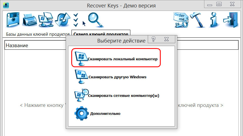 Чтобы получить комплексно информацию о ключах активации и Windows, и установленных в неё сторонних программ, можно прибегнуть к помощи программы Recover Keys. Она работает по принципу сканирования всей системы или определённых её областей и выдаёт сведения по всему найденному лицензионному программному обеспечению. Запускаем программу, выбираем «Сканировать локальный компьютер».