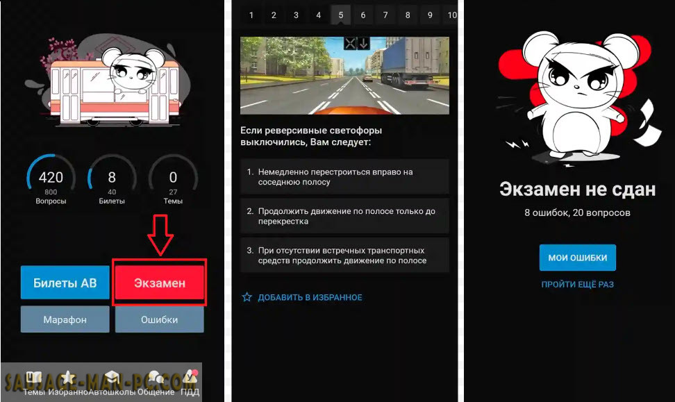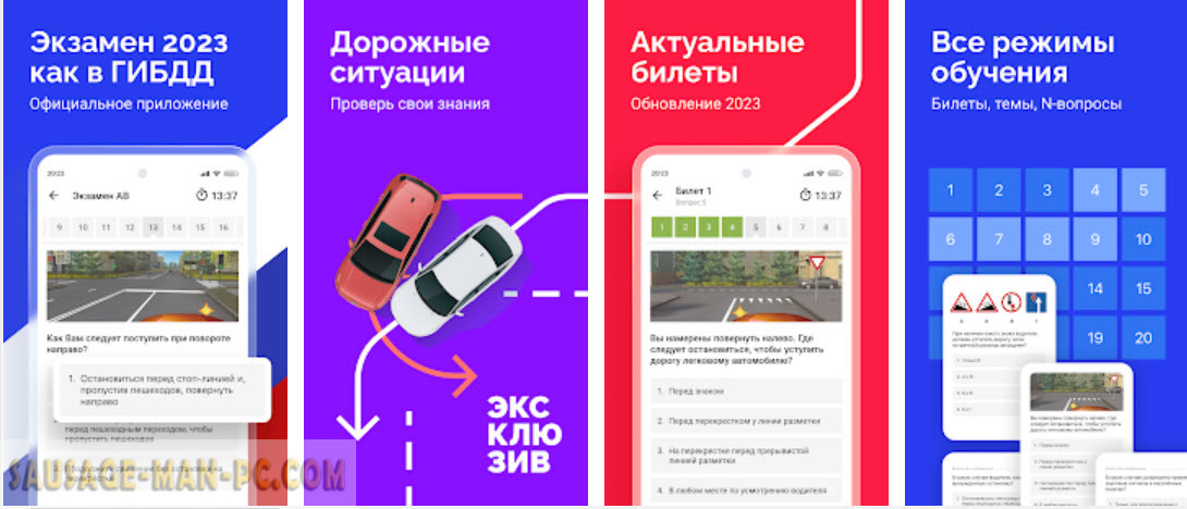 Данное приложение предназначено для мобильных устройств. Но с помощью специального эмулятора, возможно проходить обучение и с компьютера. Оно состоит из уникального плана, где содержатся всевозможные ответы и вопросы, которые ждут будущего водителя на экзамене: