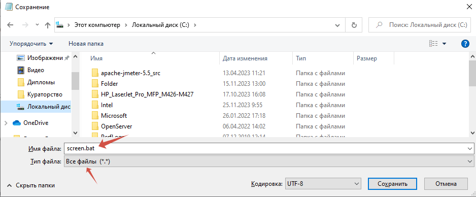 Примечание: чтобы создать .BAT файл откройте приложение Блокнот и поместите этот код туда. Затем нажмите в Блокноте Файл-Сохранить как и выберите тип и имя файла как на рисунке. Сохраните, например на диск C: