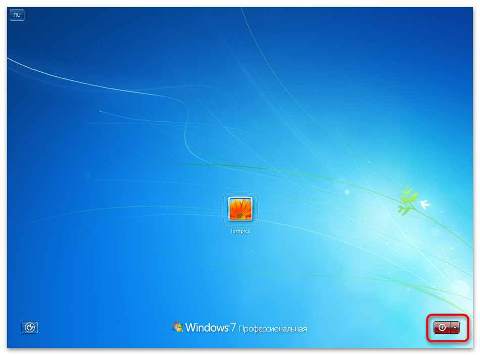 Второй метод — использование кнопки в окне переключения сеансов, что актуально для тех ПК, за которыми работает несколько пользователей под разными учетными записями и переключение между ними происходит постоянно. На следующем скриншоте вы видите ту самую кнопку, которую и необходимо нажать для выключения устройства. Этот метод тоже является безопасным, хоть и не сохраняет изменения, поскольку все сеансы уже должны быть завершены.