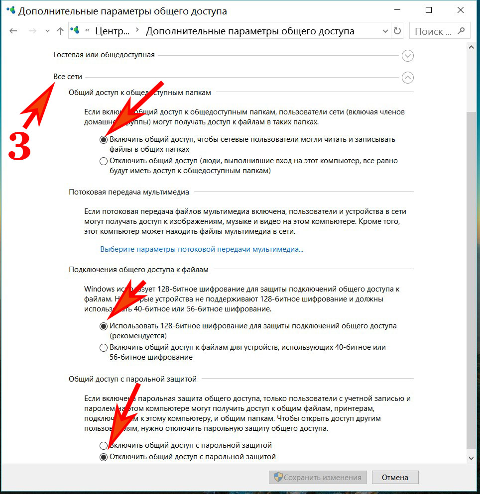 Еще здесь нужно отключить доступ с парольной защитой, чтобы каждый пользователь имел возможность пользоваться файлами и папками.