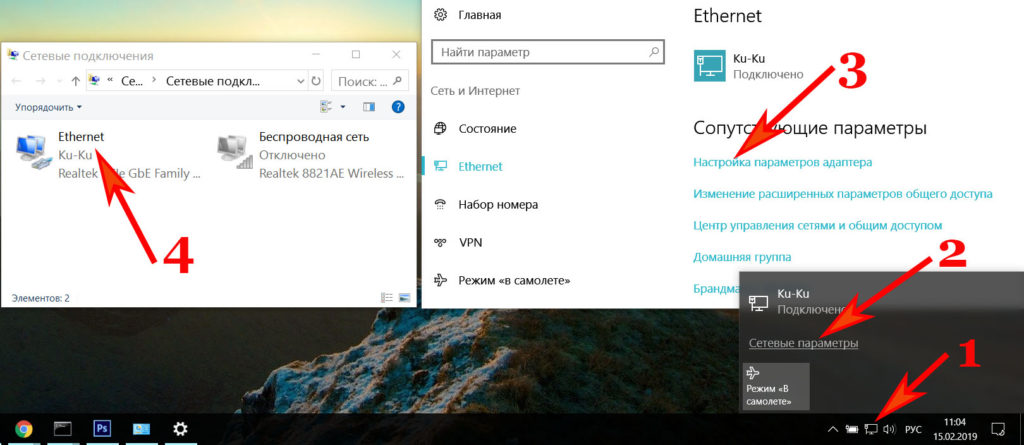 - Клацаем на строке «Настройка параметров адаптера». Попадаете в окно всех модулей, нам необходим адаптер «Ethernet».