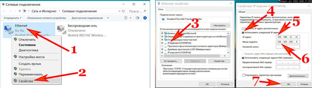 Если ваша связь выполнена при помощи роутера и включен DHCP сервер, то следует установить такие настройки в показанном окне: