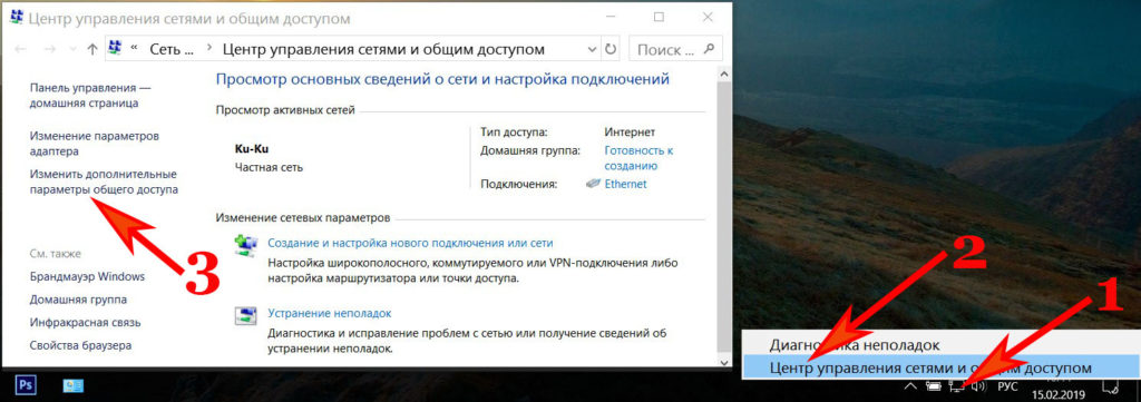 Клацаем левой клавишей мышки на иконку «Сеть», далее «Центр управления сетями….», «Изменить дополнительные параметры….».