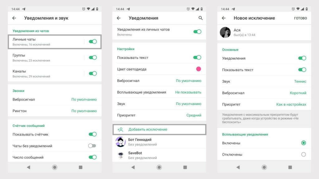 В разделах «Личные чаты»,«Группы» и «Каналы», которые находятся в «Уведомлениях и звуках», вы можете задать общие настройки для разделов. Например, сделать так, что все группы и каналы работают в беззвучном режиме или личные сообщения приходят с определенным звуков, а новости с каналов – на вибро. Кроме этого, можно задать индивидуальные настройки для каждого контакта. Нажмите «Добавить исключение» и выберите: