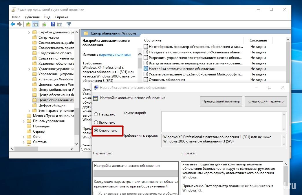 Важно! Этот способ работает только для Windows 10 Pro и Enterprise. Отключение обновлений с помощью редактора групповых локальных политик считается самым надежным способом