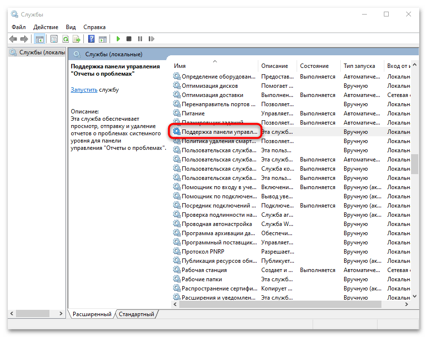 В списке найдите такие службы, как «Поддержка элемента панели управления» и «Служба регистрации ошибок Windows». При необходимости их названия можно упорядочить по алфавиту, кликнув по строке «Имя» вверху.
