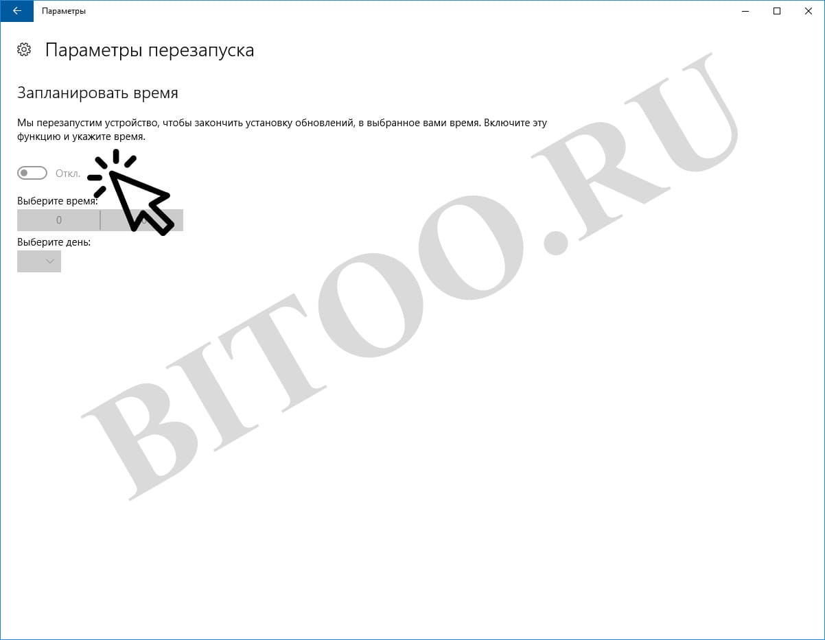 Этим пунктом мы выключим автоматическую перезагрузку компьютера, если Windows 10 уже закачал и установил обновления. А также отключите ползунок в «Запланировать время»