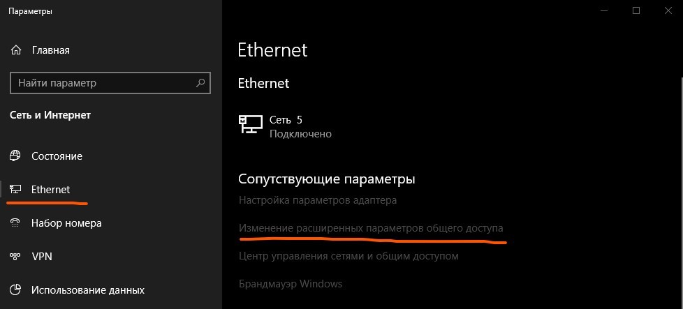 В настройках Windows (на обоих компьютерах) нужно перейти в Параметры -> Сеть и Интернет -> Ваше_сетевое_подключение (Ethernet или Wi-Fi) -> Изменение расширенных параметров общего доступа (Settings > Network & Internet > Ethernet -> Change advanced sharing options).