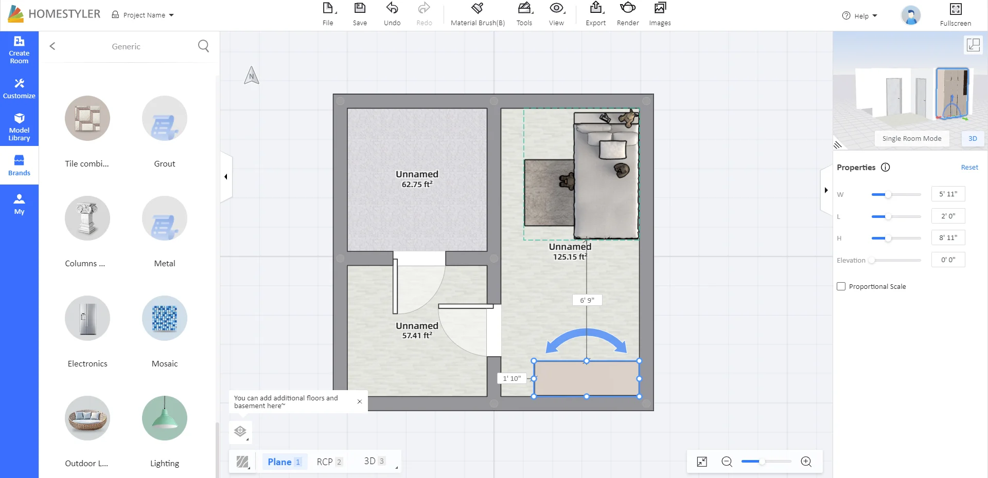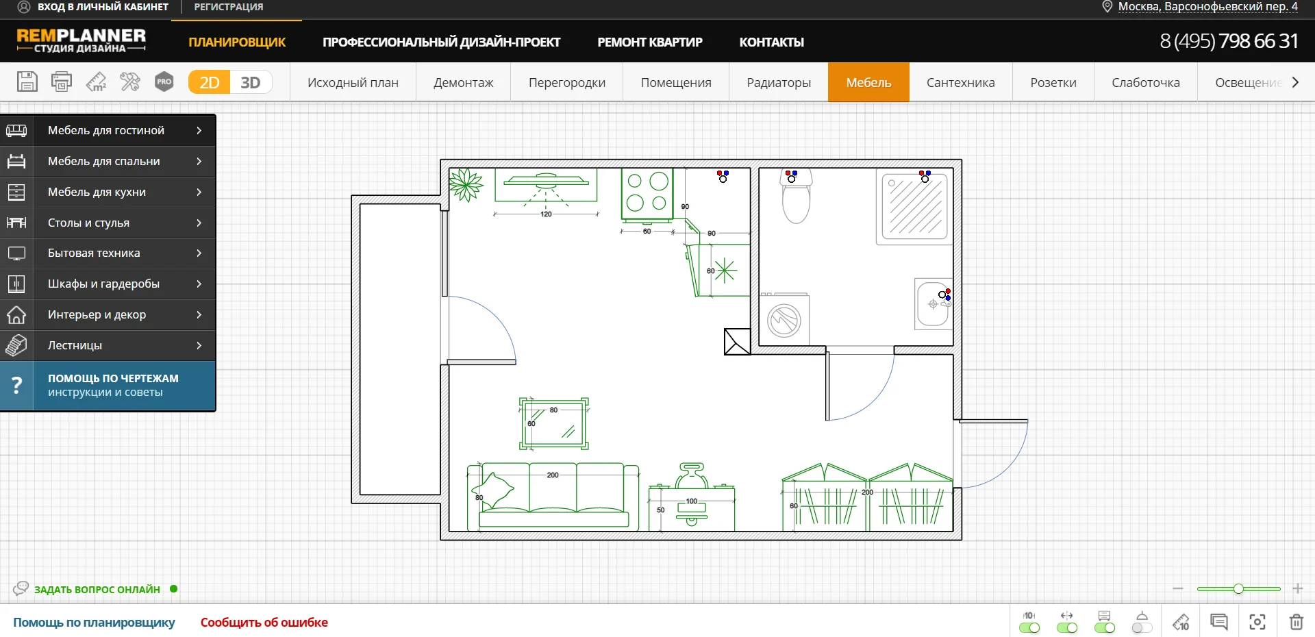 Редактирование макета происходит в браузере и вам не нужно загружать программное обеспечение на компьютер. Проект будет отображаться только в 2D. Для оформления трехмерной модели необходимо приобрести платную подписку за 490 рублей в месяц.