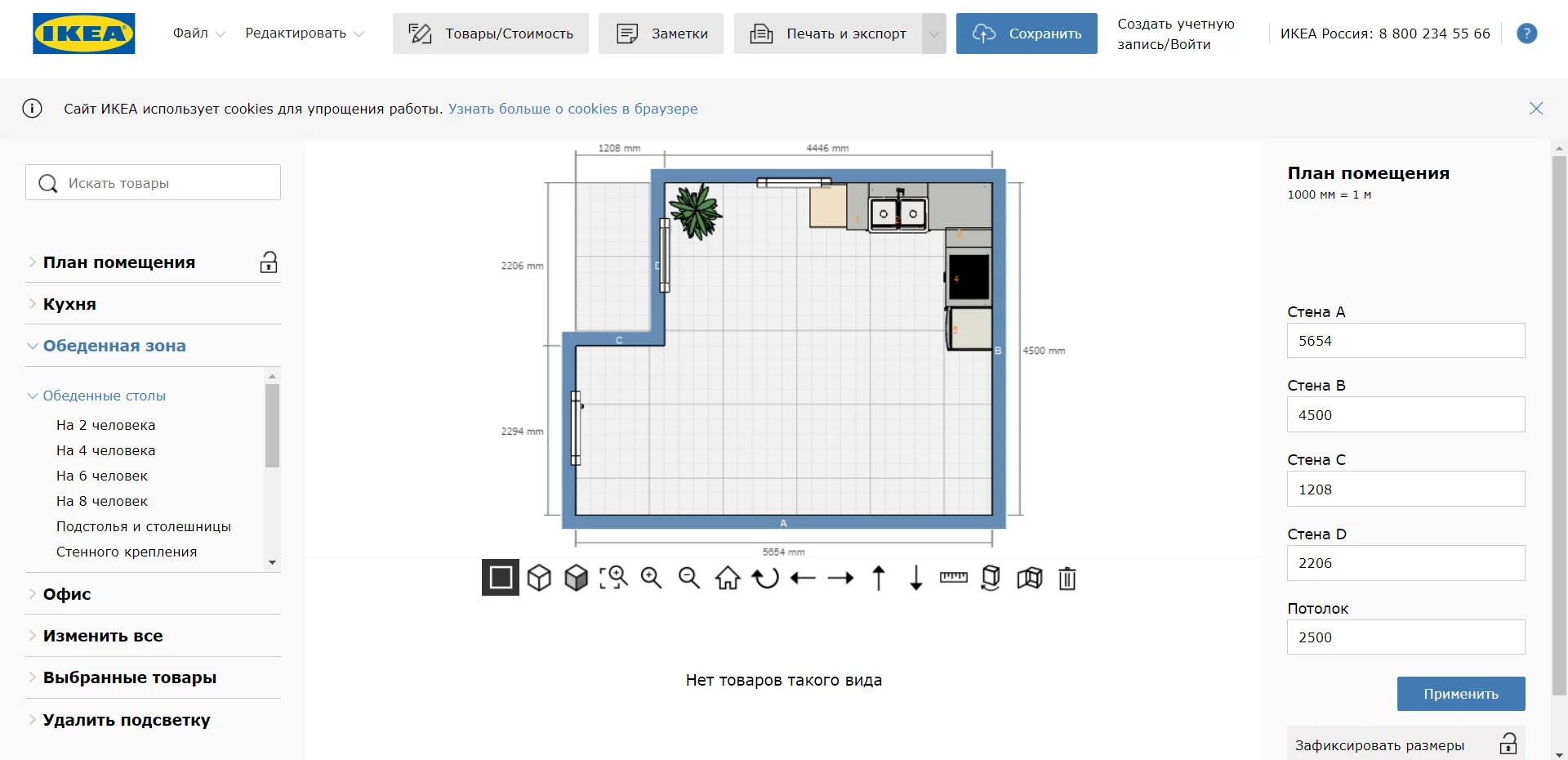 Оформление планировки квартиры онлайн возможно с помощью сервиса от мебельной компании IKEA. Он содержит разные режимы работы: проектирование кухонь и столовых, гардеробов, диванов и кроватей, офиса, ванных комнат, оформление стен и окон. Вы сможете настроить чертеж под особенности дома, а затем разместить двери, окна и поставить предметы. После добавления товаров можно ознакомиться с их стоимостью и приобрести в магазине.