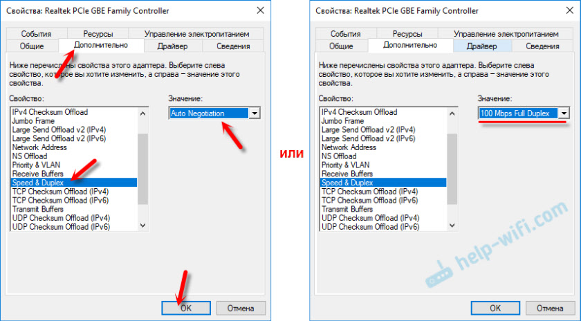 . И слева в выпадающем меню установите значение «Auto Negotiation». Но если у вас там изначально был установлен данный вариант, то попробуйте поставить другое значение. Например: «100 Mbps Full Duplex». Можно попробовать разные варианты. Не забывайте нажимать Ok и перезагружать компьютер.