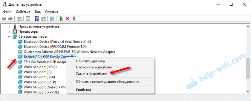 Кстати, обратите внимание, нет ли возле него желтого значка. Нажимаем на него правой кнопкой мыши и выбираем «Удалить устройство»