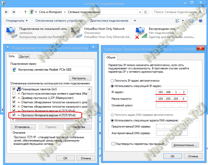 На втором — прописываем адрес 192.168.1.2 маска 255.255.255.0: