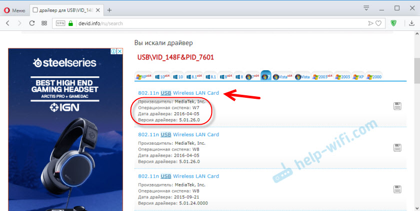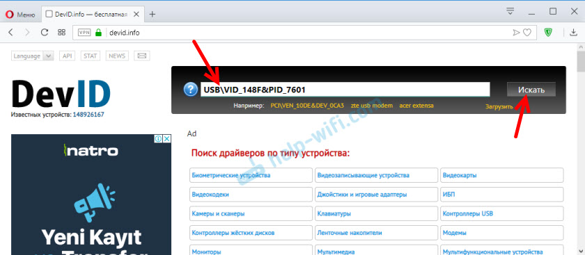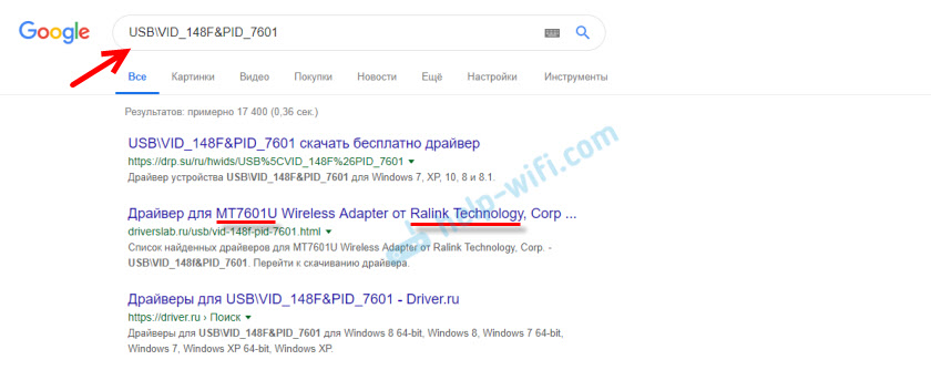 Просто вставляем ИД в Google, или Яндекс и смотрим найденную информацию. Сразу в результатах поиска я уже вижу, что мой адаптер построен на чипе MT7601U от Ralink. Мы знаем производителя, и можем вернутся к загрузке драйвера с официального сайта (ноутбука/адаптера). Или искать драйвер для чипсета Ralink MT7601U (по модели).