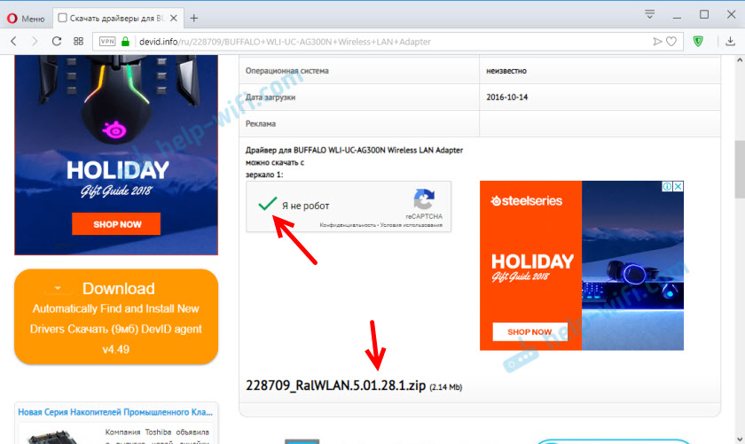 На следующей странице перед тем, как приступить к скачиванию, необходимо будет ввести антикапчу, поставив галочку напротив строки «Я не робот». Ниже этой области вы увидите две ссылки на скачивание драйвера. Первая ссылка на скачивание архива с драйверами, а вторая — оригинальный установочный файл. Выбрав нужный вариант, кликаем по самой ссылке.