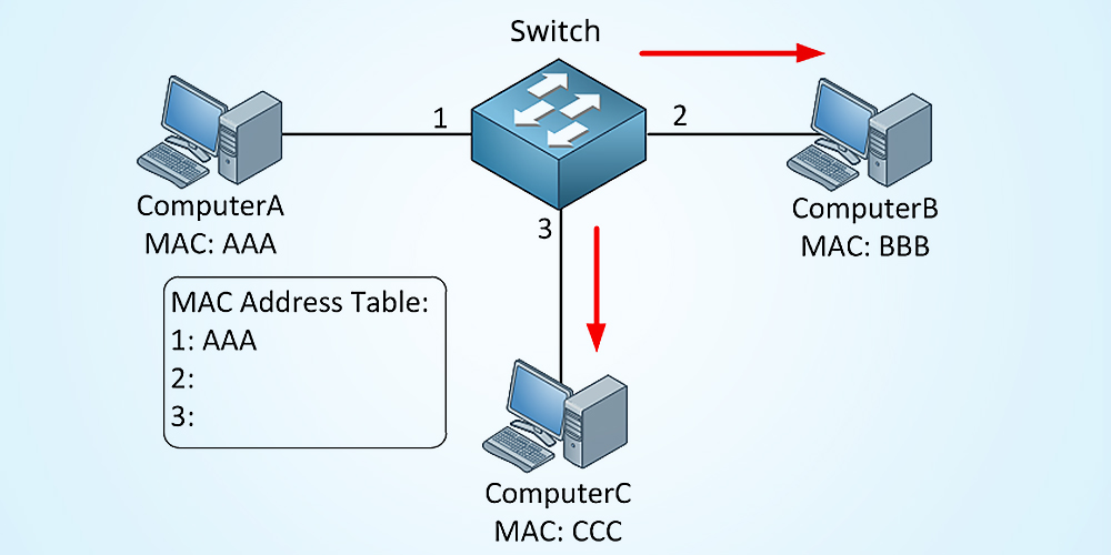 Компьютер A будет отправлять некоторые данные, предназначенные для компьютера B, поэтому он создаст канал Ethernet, который имеет MAC адрес источника (AAA) и MAC адрес назначения (BBB). Коммутатор имеет таблицу MAC адресов, и вот что произойдет: