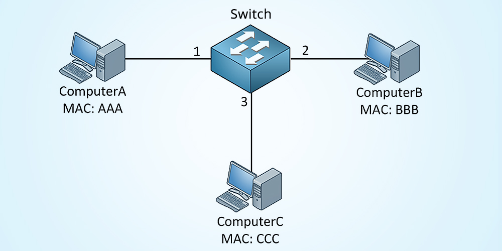 Посередине есть коммутатор, а вокруг 3 компьютера. У всех компьютеров есть МАС адрес, но они упрощены как АА, ВВВ и ССС. Коммутатор имеет таблицу МАС-адрсов и узнает, где находятся все МАС адреса в сети. Теперь, предположим, что компьютер А собирается отправить что-то на компьютер В: