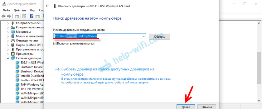 Дальше пункт «Выполнить поиск драйверов на этом компьютере» и указываем путь к папке с драйвером.
