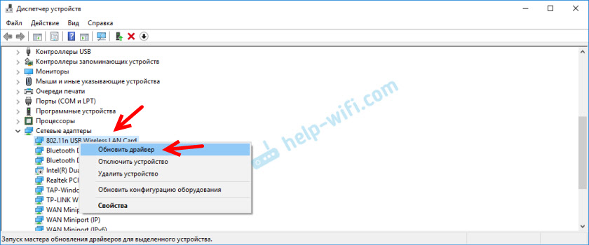Правой кнопкой мыши на устройство (для которого мы загружали драйвер) и выбираем «Обновить драйвер».