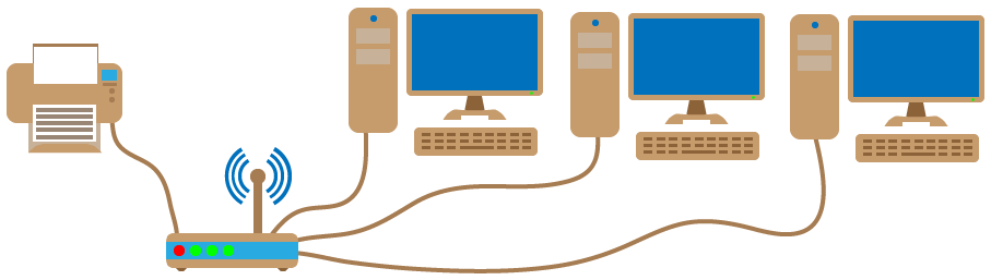 Максимально легко организовать печать по сети, если все устройства могут подключаться без проводов. Это касается компьютеров (или ноутбуков) и принтеров. Тогда не нужно заморачиваться над покупкой кабелей. Следует только разместить всю аппаратуру в одной сети. Значит, не обойтись без роутера. После, везде ставится один и тот же драйвер.