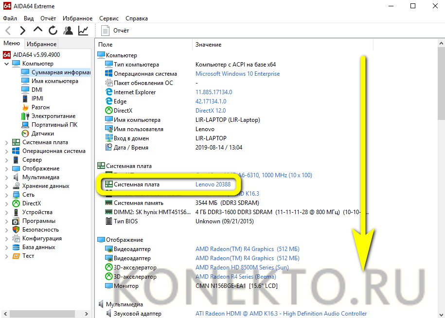 В левой части окна программы понадобится нажать на знак «+» около пункта «Компьютер», затем выбрать строку «Суммарная информация». В правой части окна в разделе «Системная плата» напротив одноименного пункта будет указана компания-изготовитель и модель ноутбука.