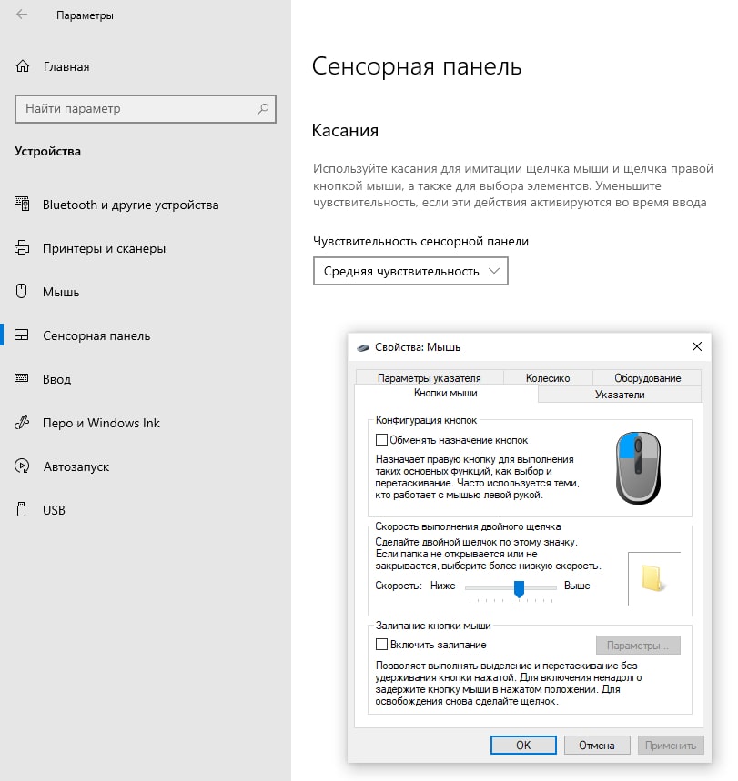 - В окне свойств мыши перейдите на вкладку, связанную с параметрами тачпада. Она может называться «Настройки устройства», «ELAN», «Synaptics» или подобное, в зависимости от используемого драйвера.