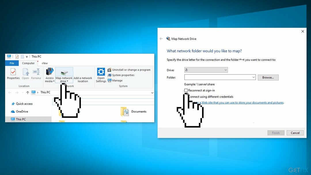 - Выберите нужный диск и путь к папке. Обязательно снимите флажок Повторное подключение при входе вариант и нажмите кнопку Заканчивать кнопка