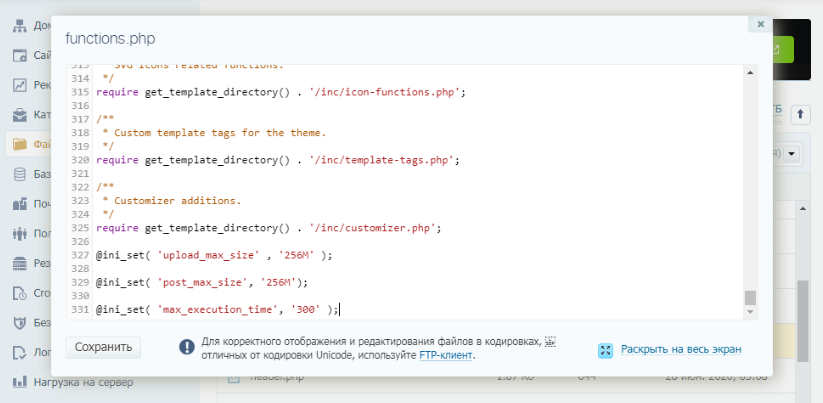 - Скачиваем файл functions.php, открываем его в текстовом редакторе.