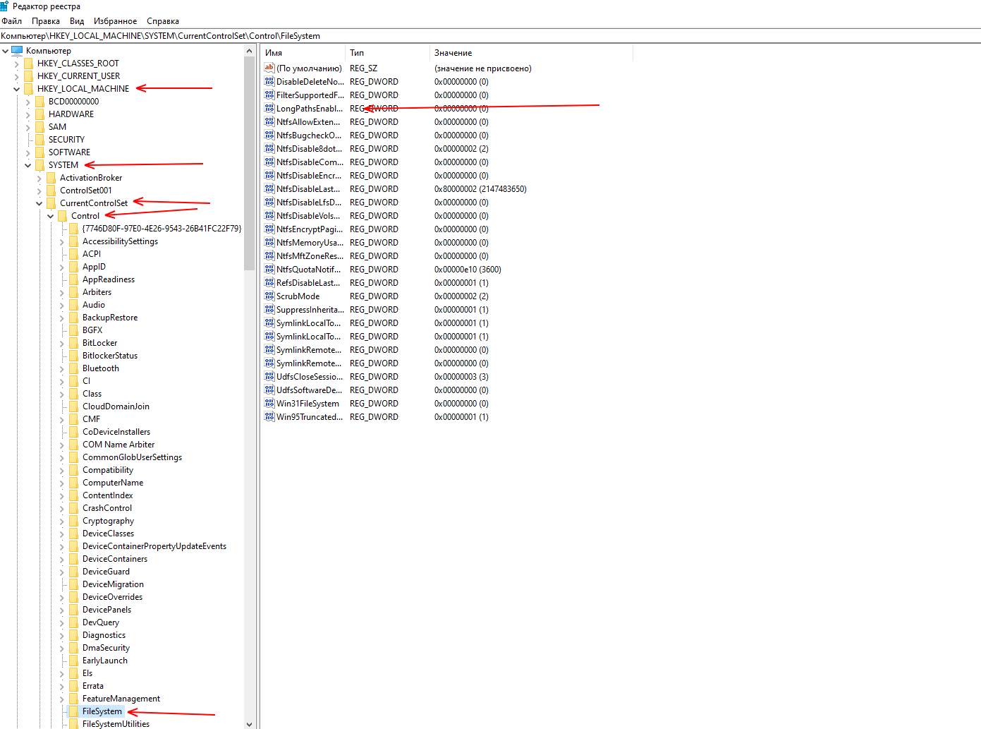 Когда откроется редактор реестра, на левой панели перейдите к ключу HKEY_LOCAL_MACHINESYSTEMCurrentControlSetControlFileSystem. В правой панели найдите и дважды щелкните LongPathsEnabled DWORD. Если этот ключ недоступен, вам необходимо создать его вручную.