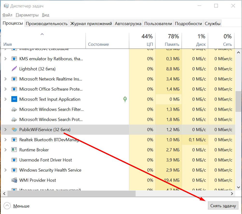 После обнаружения виновного приложения нужно остановить его работу через всё тот же «Диспетчер задач». Открываем его сочетанием Ctrl+Shift+Esc, переходим на вкладку «Процессы», находим компонент, связанный с приложением, и завершаем его выполнение.