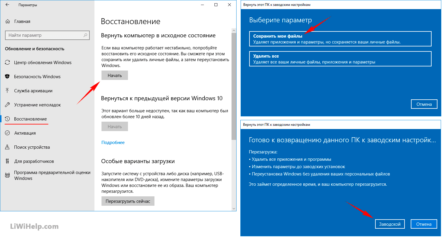 Этот способ позволит восстановить работоспособность ноутбука только в том случае, если ранее пользователем не производилась переустановка операционной системы. В процессе выполнения этой операции информация с жёсткого диска будет удалена, поэтому следует заранее сохранить важные документы на съёмном носителе. Восстановление заводских установок ноутбука осуществляется в такой последовательности: