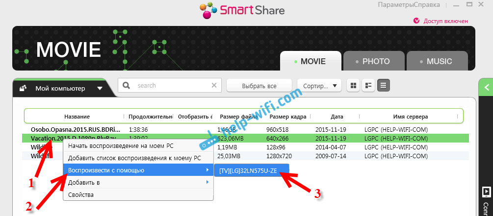 Откроется окно, со списком например Фильмов (если вы выбрали вкладку MOVIE). В программе будет отображаться все видео, которое было найдено в папках, которые мы добавили в процессе настройки (смотрите выше). Что бы запустить просмотр фильма (фото, или воспроизведение песни) на телевизоре LG, достаточно нажать на нужный нам файл правой кнопкой мыши, и выбрать Воспроизвести с помощью, и название вашего телевизора. Напомню, что он должен быть включен и подключен к одной сети с компьютером.