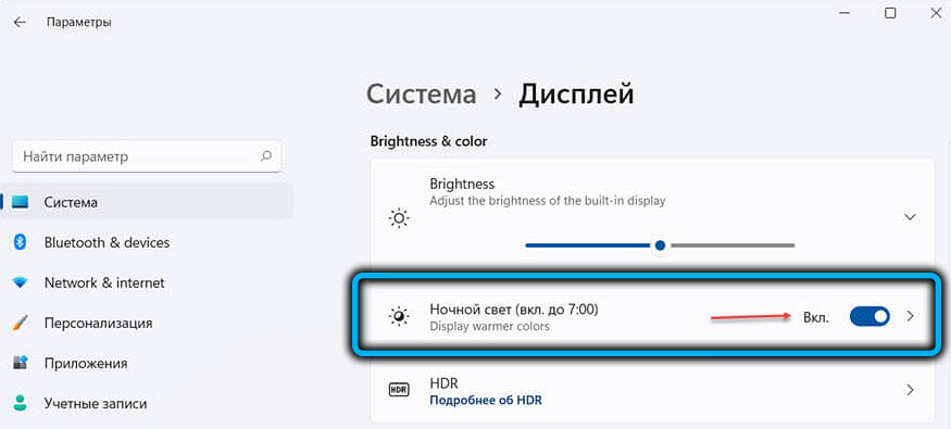 Именно поэтому в Windows 11 появилась функция настройки яркости, именуемая «Ночной свет», которая меняет спектральный диапазон экрана в сторону более тёплых тонов, снижая нагрузку на зрение. Функция доступна в разделе «Система» приложения «Параметры», во вкладке «Дисплей». Здесь же можно регулировать спектральную составляющую излучения монитора: чем дальше вправо переместить ползунок, тем теплее окажется источник света.