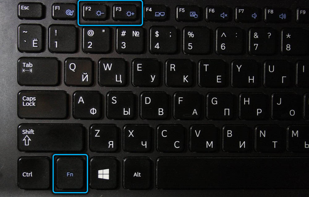 Самый простой вариант, как повысить яркость экрана ноутбука – сочетание кнопок. Все мировые производители портативных компьютеров (Asus, Lenovo, Samsung, HP, Acer) по умолчанию имеют горячие комбинации клавиш через функциональную кнопку Fn. Она расположена на самой нижней линии клавиатуры, как правило, между Ctrl и Win. Инструкция, как изменить яркость экрана на ноутбуке через функциональные клавиши: