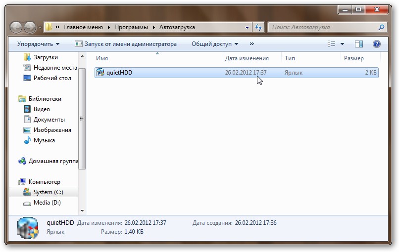 Остался еще один небольшой штрих. Чтобы винчестер работал менее шумно (с меньшим значением AAM) необходимо, чтобы эта утилита работала в фоне. Нужно ее добавить в список автозагрузки, чтобы не включать каждый раз при включении ноутбука.
