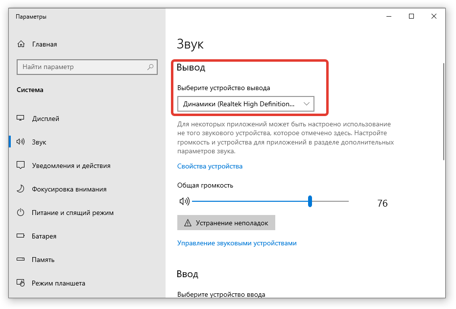 - Во вкладке «Вывод» определить нужное устройство, обычно это «Динамики — Устройство с поддержкой High Definition Audio».