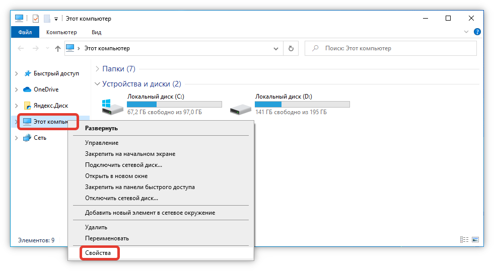 - Найти вкладку «Этот компьютер», кликнуть ПКМ и выбрать «Свойства».