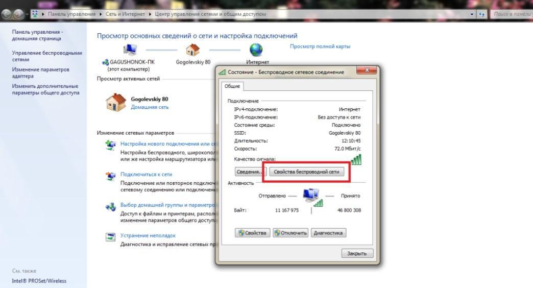 - найти пароль можно еще одним простым способом — обратиться к панели управления стационарного компьютера или ноутбука. Пользователю нужно попасть в раздел «Управления сетями и общим доступом». Далее необходимо перейти в раздел «Управление беспроводными сетями», найти там необходимую беспроводную сеть и через правую кнопку мыши в контекстном меню ознакомиться с пунктом «Свойства». В разделе «Безопасность» нужно напротив графы отображения вводимых знаков установить галочку, тем самым открывая доступ к ключу безопасности.