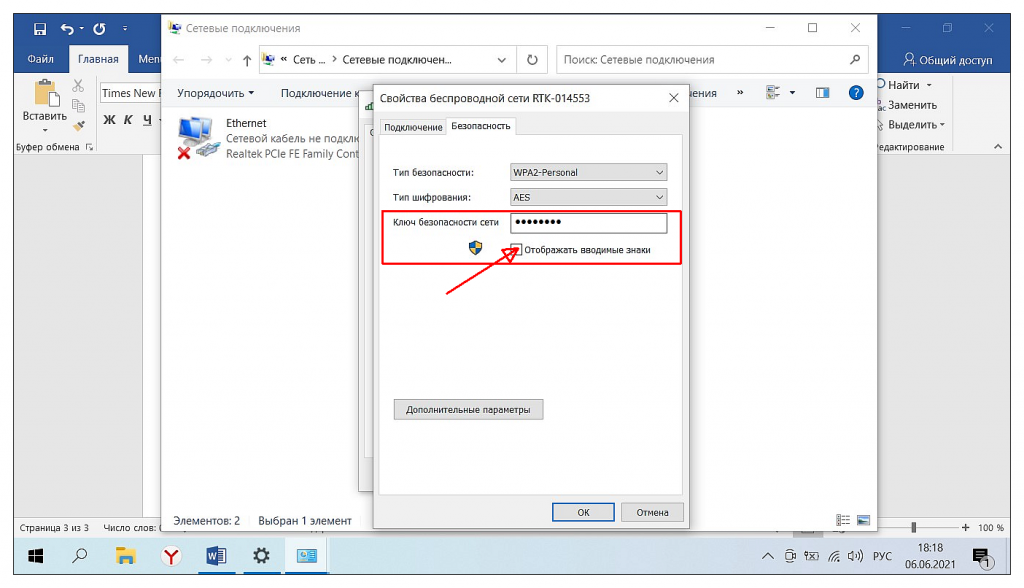 - Во вкладке “Безопасность” поставьте галочку в окошке “Отображать вводимые знаки”. Вы увидите текущий ключ безопасности сети для данного подключения и сможете ввести его на другом устройстве.