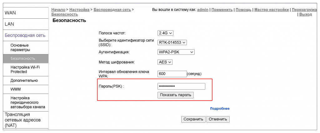 - пожалуй, самый простой, но и эффективный способ посмотреть секретный код — это обратиться к меню настроек маршрутизатора. В подавляющем большинстве случаев по умолчанию установлены логии и пароль «admin» и «admin». Достаточно просто ввести данную комбинацию в соответствующие формы и нажать на кнопку «Далее», чтобы зайти непосредственно в веб-интерфейс девайса. После захода в панель управления нужно пройти путь: «Беспроводной режим» — «Защита». Среди доступных опций как раз находится пароль PSK;